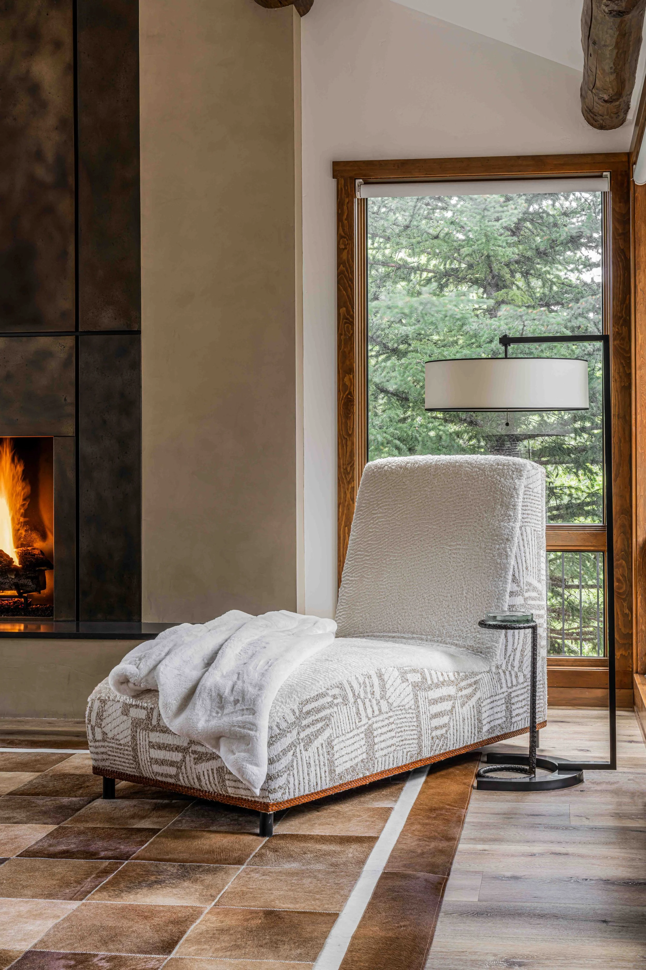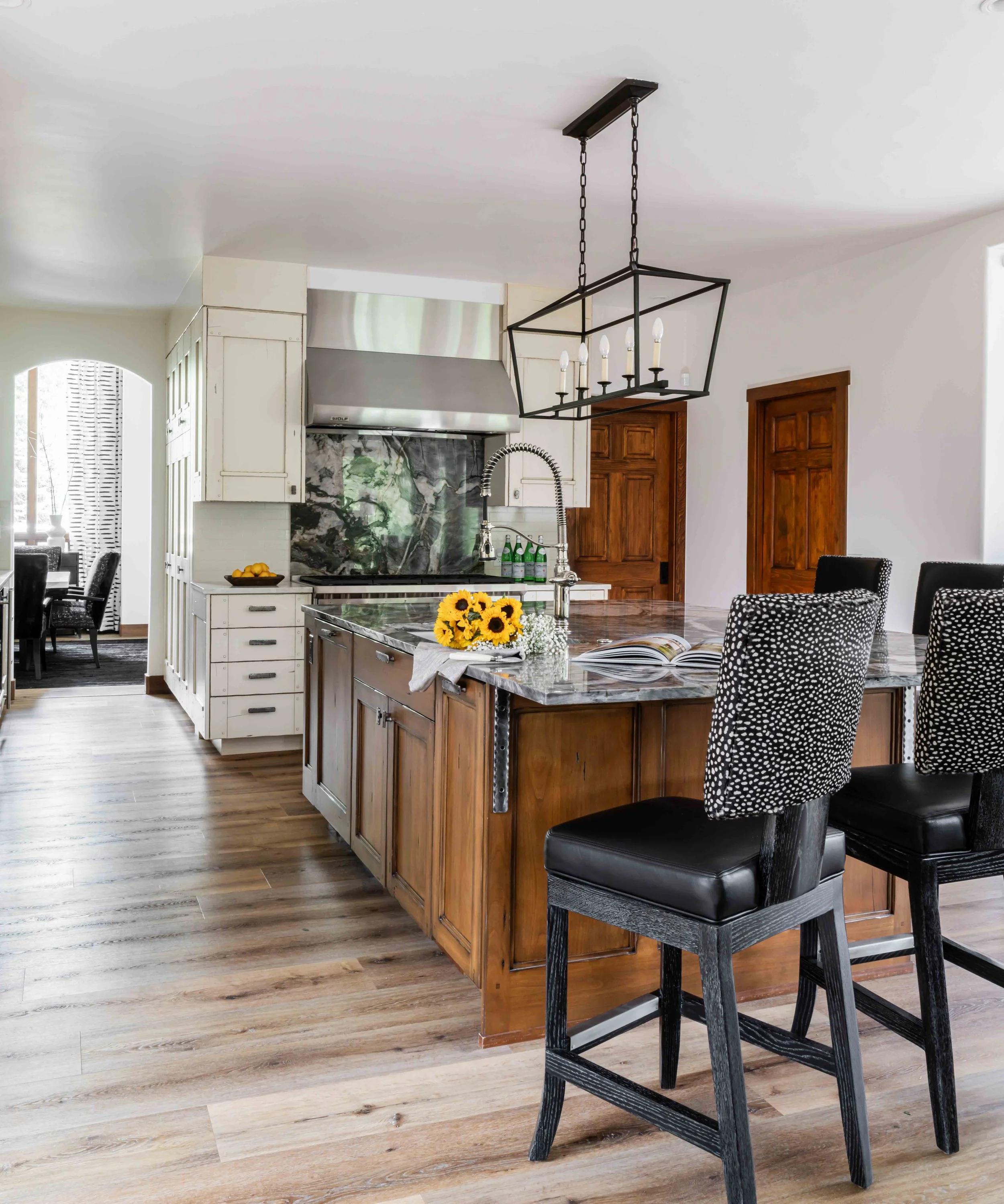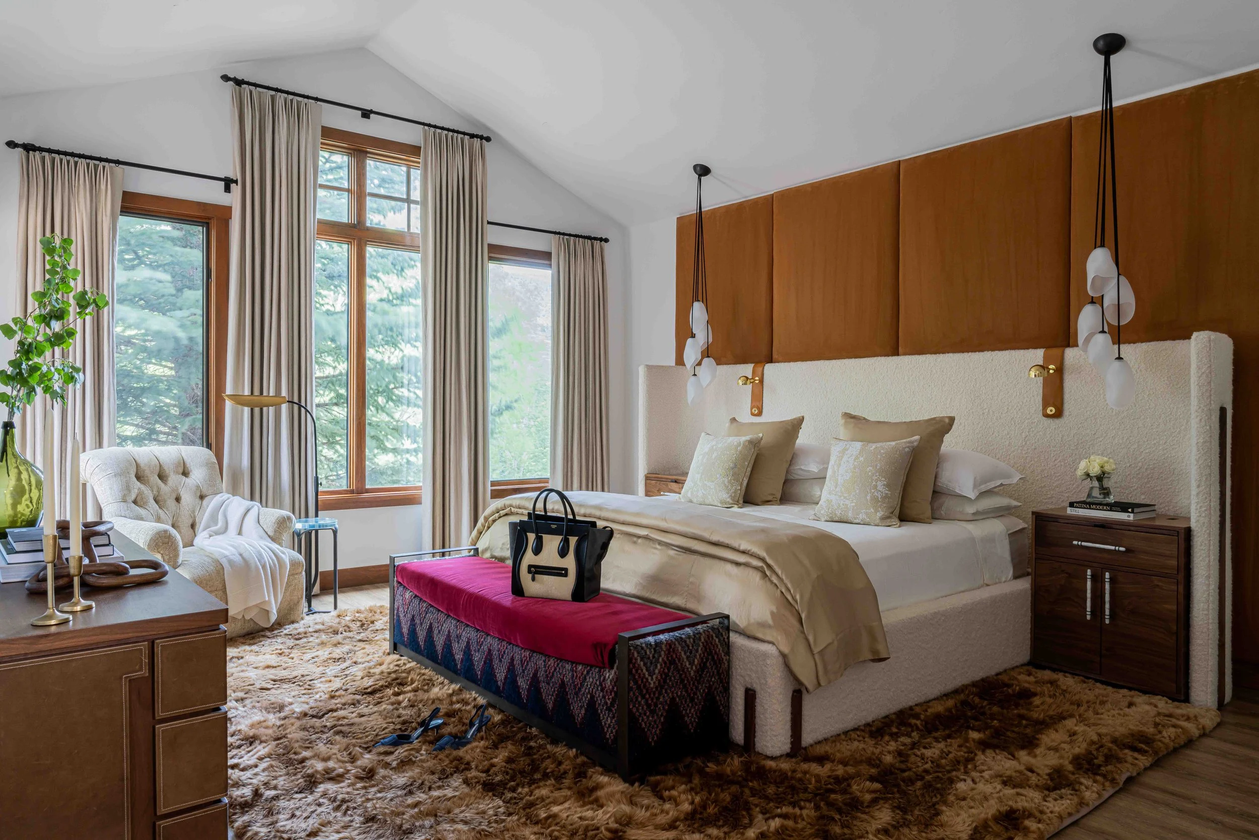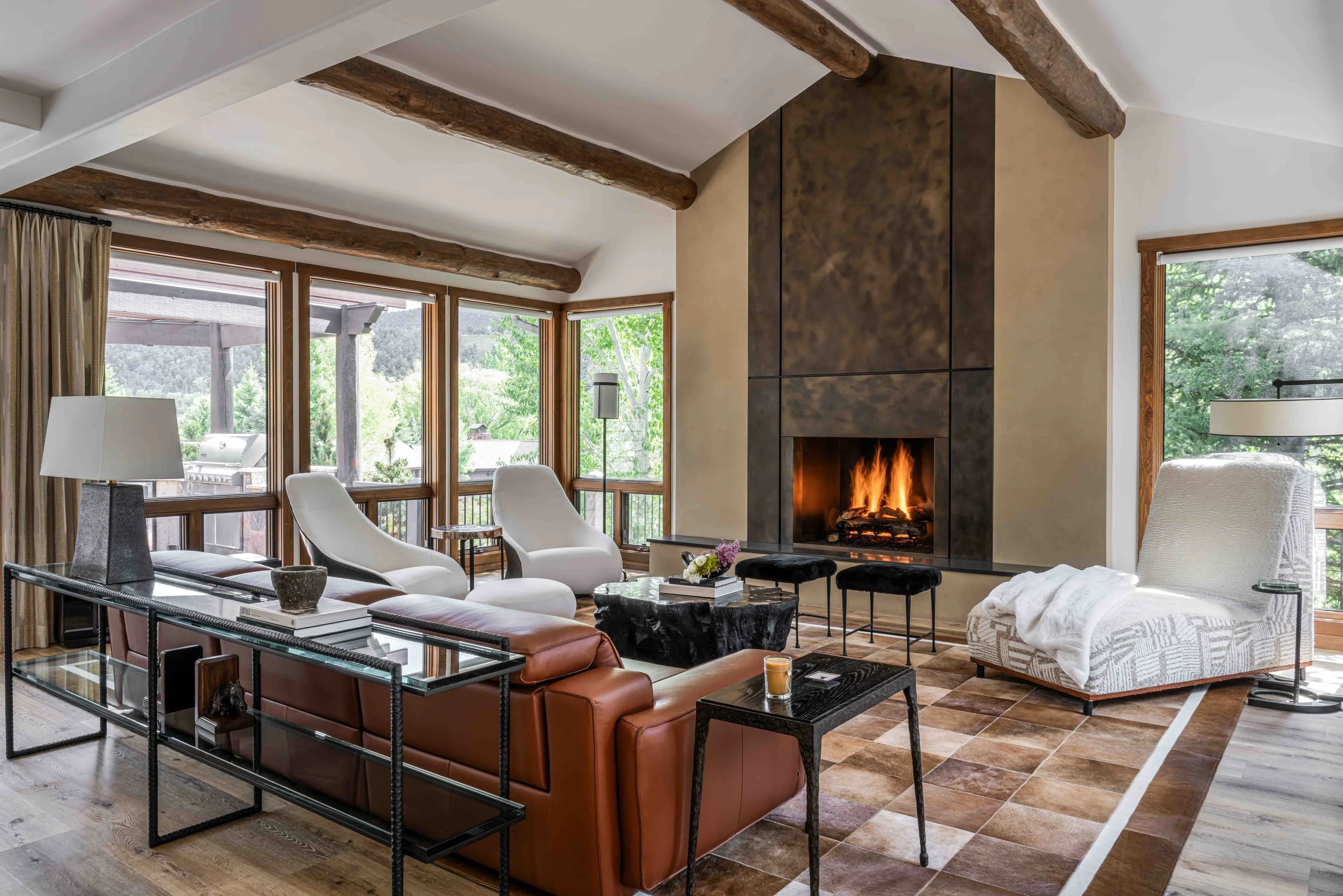 A 4,000 Square Foot Renovation of a dated mountain home underwent a mountain modern transformation. Utilizing materials found within the mountain region; leather, metal, wood and furs were the primary focus. In the family room, a custom patina metal fireplace was implemented as the focal feature of the home with a hair on hide rug and a leather modern sofa. In the formal living area, another fireplace was replaced with the same custom patina metal to provide a consistent theme throughout the house while warming up the space with bespoke Mongolian fur wingback chairs. In the opposite side of the formal living room sits the acrylic and black piano which is juxtaposed by antique artwork and a traditional silk jute rug. A 16-drop crystal chandelier cascades over the 70” square parrot wood and black resin dining table surrounded with faux fur dining chairs atop a monotone hair on hide rug. A layered headboard of boucle fabric follows the curved outline of the walnut nightstands with blown glass pendants hanging above while a suri alpaca rug grounds the entire space.