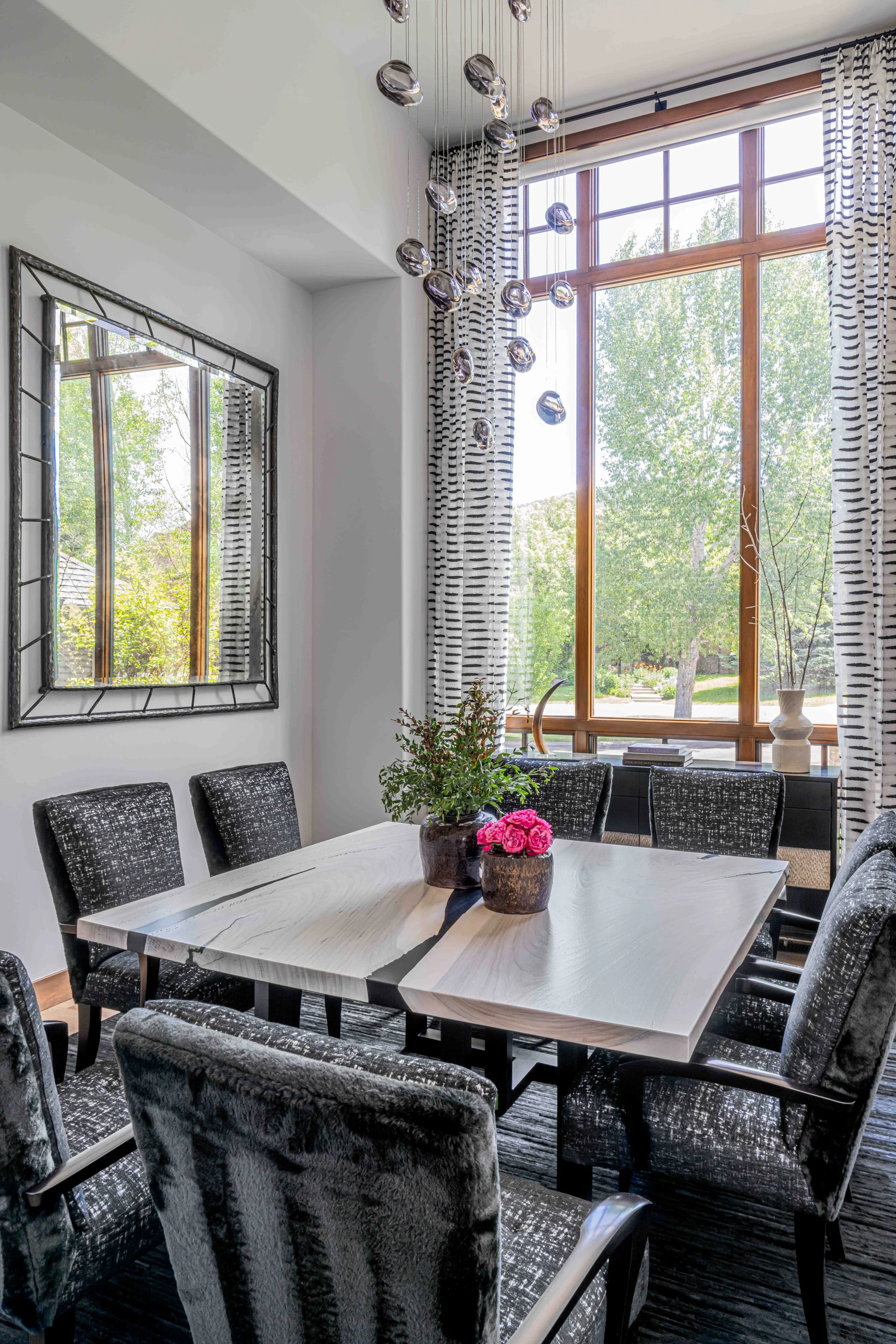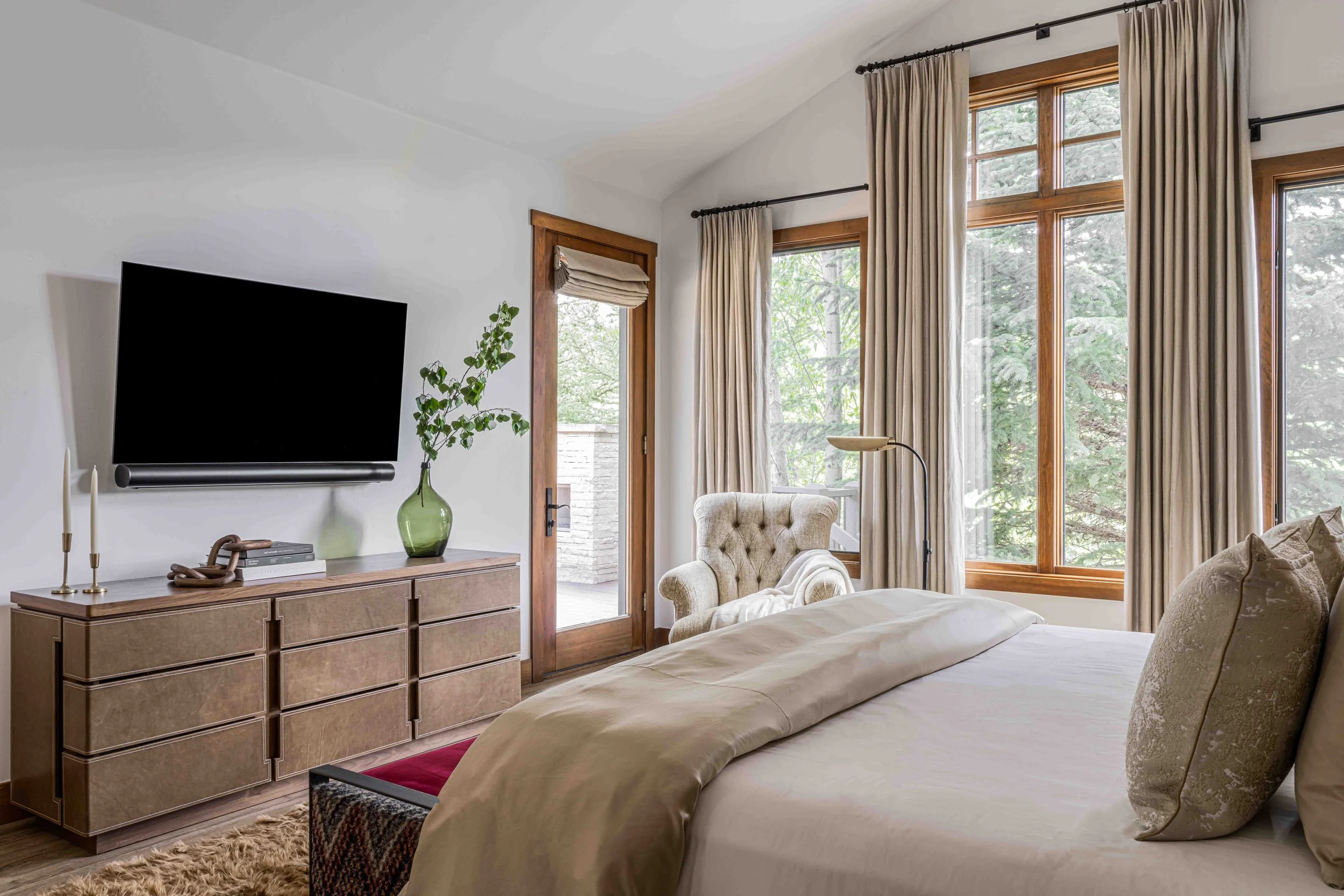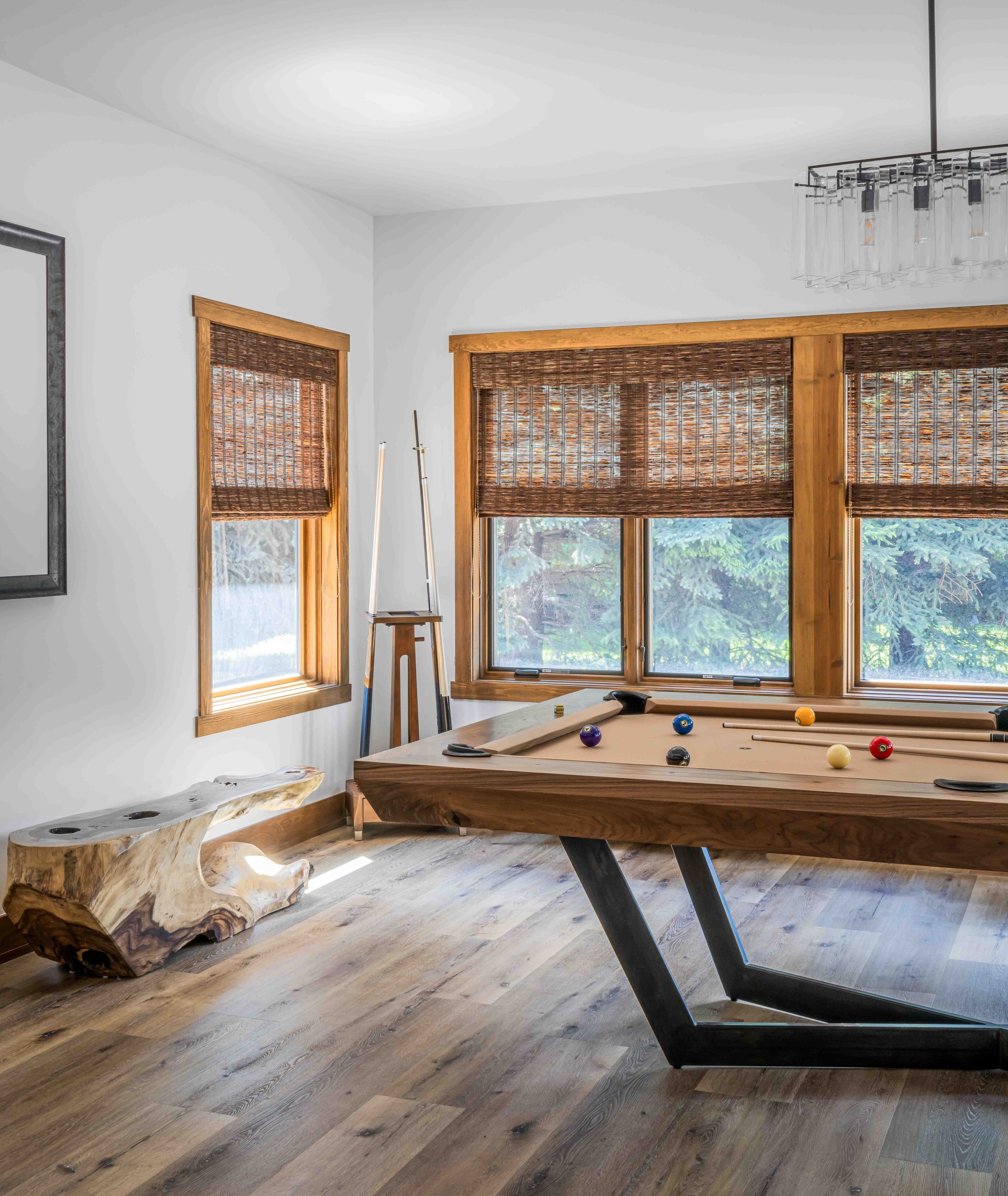 A 4,000 Square Foot Renovation of a dated mountain home underwent a mountain modern transformation. Utilizing materials found within the mountain region; leather, metal, wood and furs were the primary focus. In the family room, a custom patina metal fireplace was implemented as the focal feature of the home with a hair on hide rug and a leather modern sofa. In the formal living area, another fireplace was replaced with the same custom patina metal to provide a consistent theme throughout the house while warming up the space with bespoke Mongolian fur wingback chairs. In the opposite side of the formal living room sits the acrylic and black piano which is juxtaposed by antique artwork and a traditional silk jute rug. A 16-drop crystal chandelier cascades over the 70” square parrot wood and black resin dining table surrounded with faux fur dining chairs atop a monotone hair on hide rug. A layered headboard of boucle fabric follows the curved outline of the walnut nightstands with blown glass pendants hanging above while a suri alpaca rug grounds the entire space.
