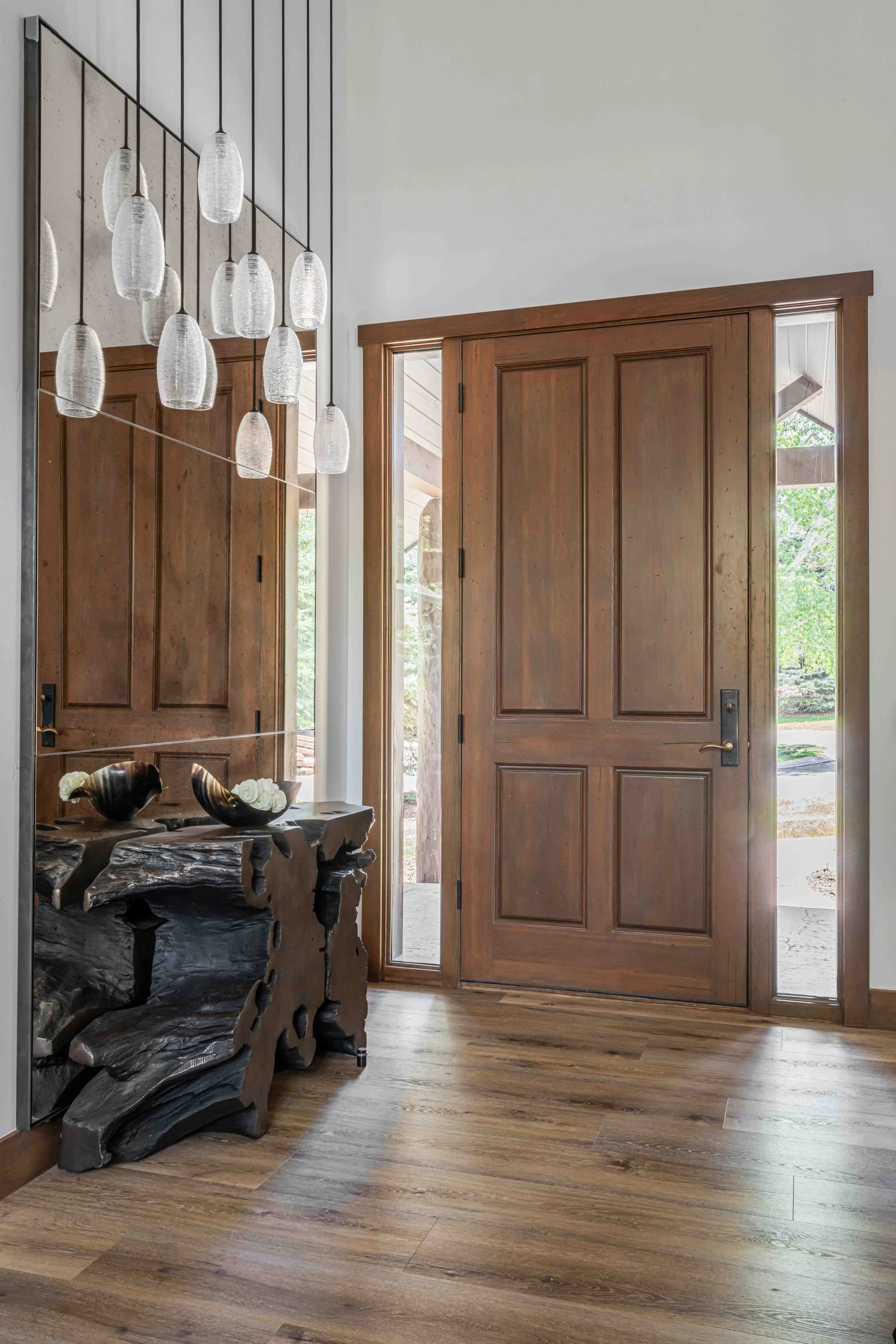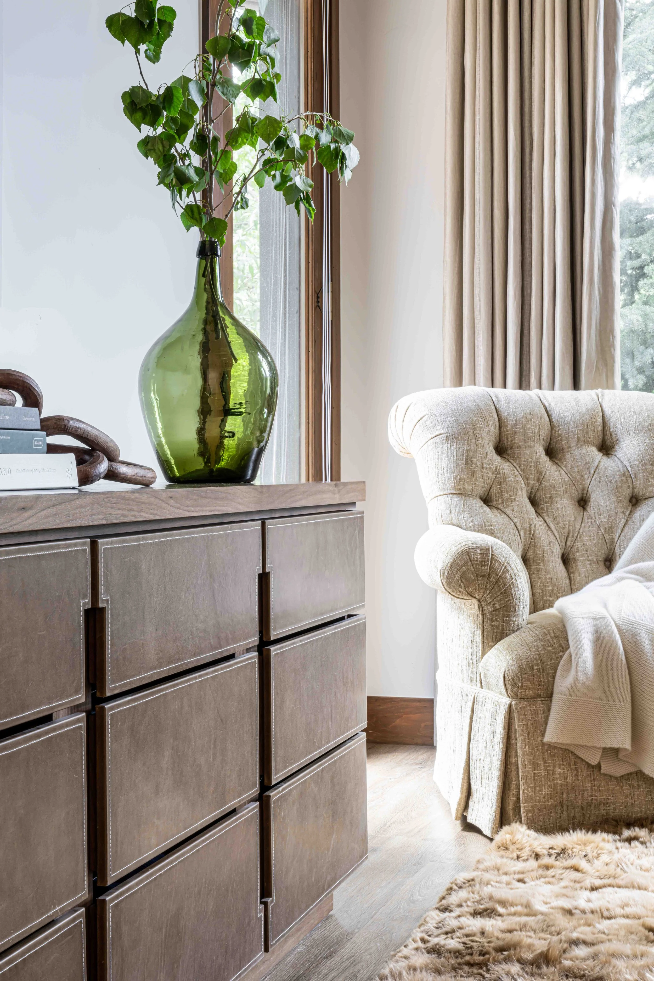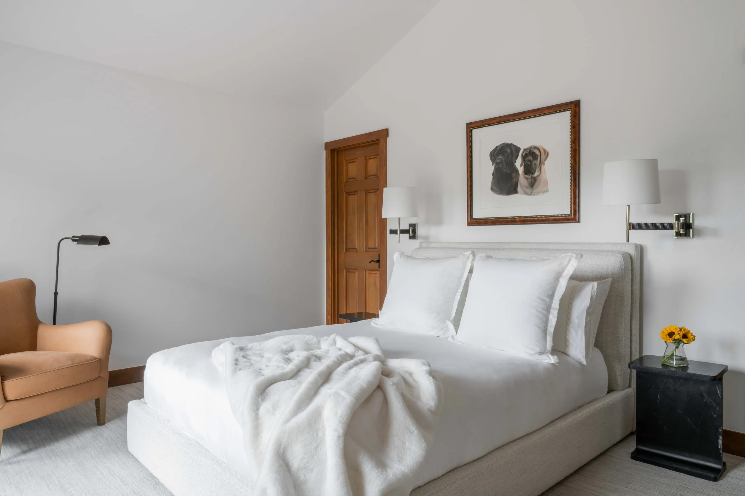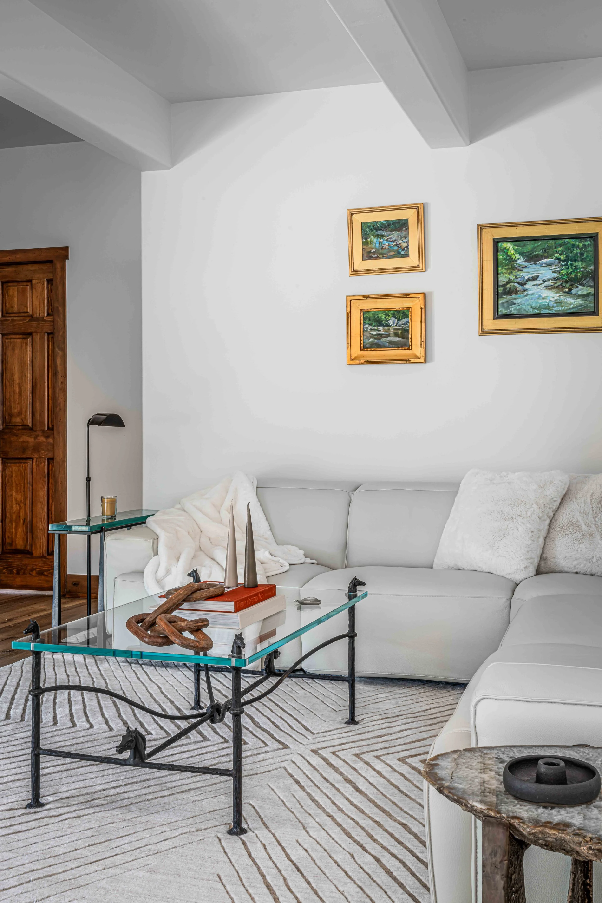 A 4,000 Square Foot Renovation of a dated mountain home underwent a mountain modern transformation. Utilizing materials found within the mountain region; leather, metal, wood and furs were the primary focus. In the family room, a custom patina metal fireplace was implemented as the focal feature of the home with a hair on hide rug and a leather modern sofa. In the formal living area, another fireplace was replaced with the same custom patina metal to provide a consistent theme throughout the house while warming up the space with bespoke Mongolian fur wingback chairs. In the opposite side of the formal living room sits the acrylic and black piano which is juxtaposed by antique artwork and a traditional silk jute rug. A 16-drop crystal chandelier cascades over the 70” square parrot wood and black resin dining table surrounded with faux fur dining chairs atop a monotone hair on hide rug. A layered headboard of boucle fabric follows the curved outline of the walnut nightstands with blown glass pendants hanging above while a suri alpaca rug grounds the entire space.